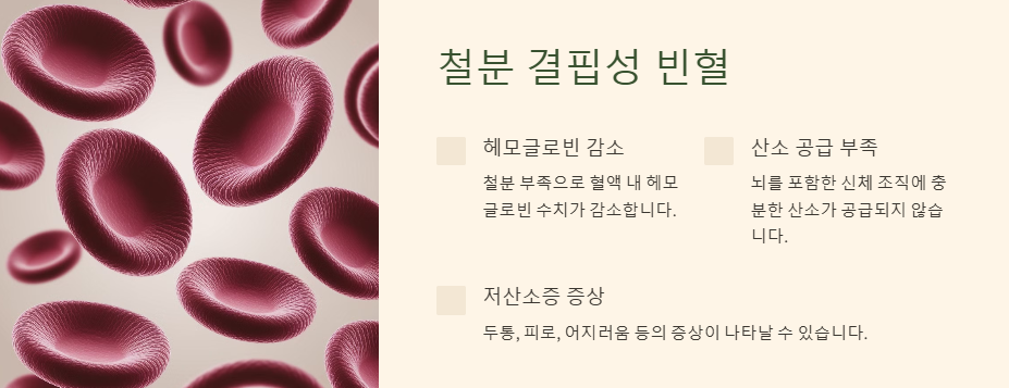 - 철분이 부족하면 혈액이 충분히 만들어지지 않아, 뇌에 산소가 제대로 공급되지 않습니다.